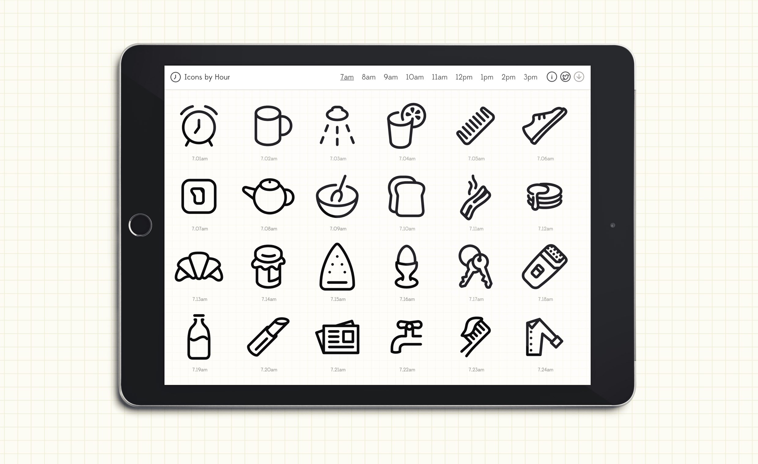 Icons by Hour is a self-initiated project that explores iconography in relation to time. The aim of the project was to give myself a platform to refine my craft in icon design by documenting everyday objects and actions in a simple visual form. The concept of the project is based on chronology; each minute of the day is represented by an icon contextual to that specific time. The icons form a visual narrative, giving a flow that represents a day in the life minute by minute.