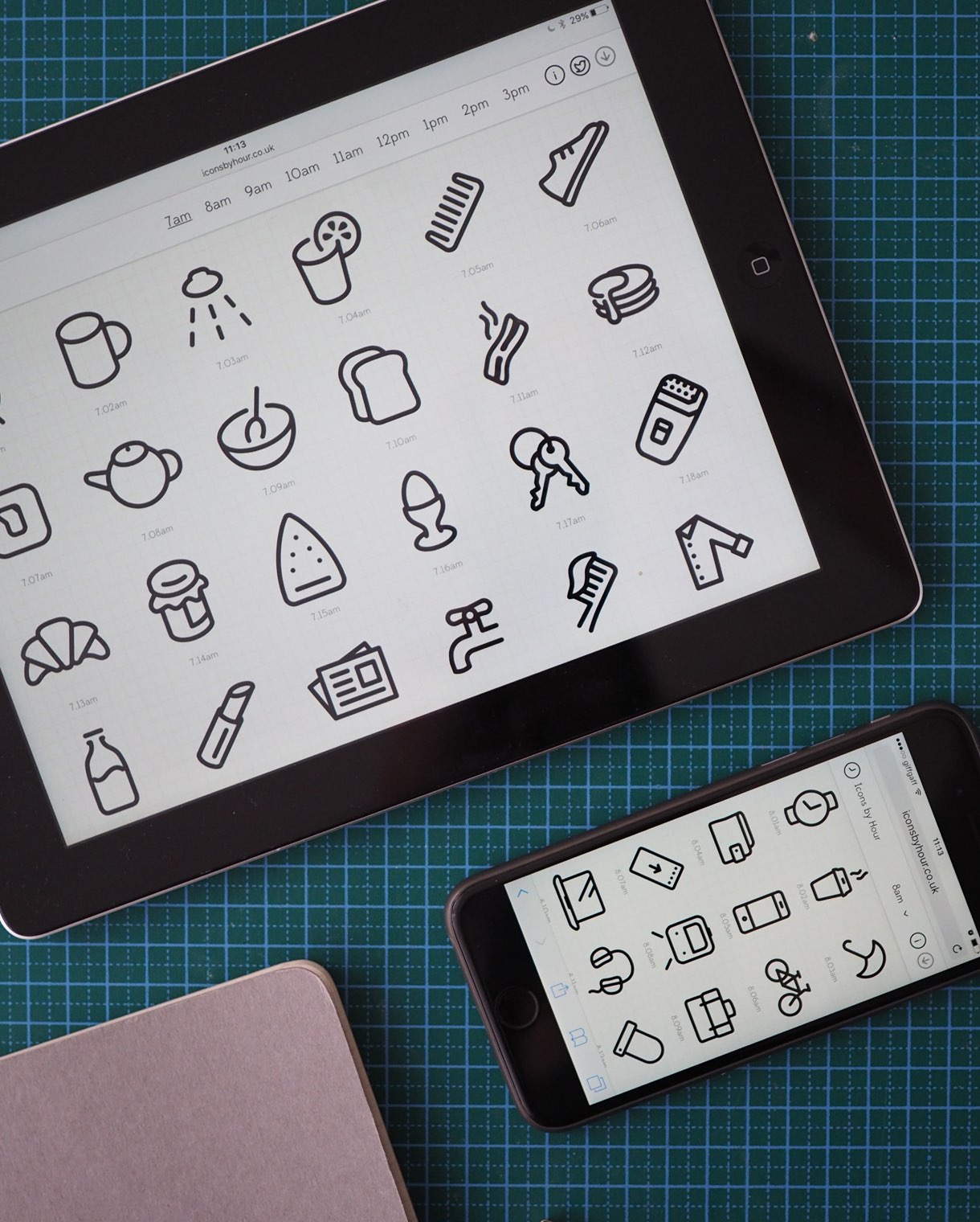 To showcase the Icons by Hour collection and give myself a future-proof framework for new icons, I created a small responsive website purely from svg files. The icons were also featured on the The Noun Project, receiving thousands of monthly downloads, and a selection of icons were used in an article for The Atlantic Magazine.